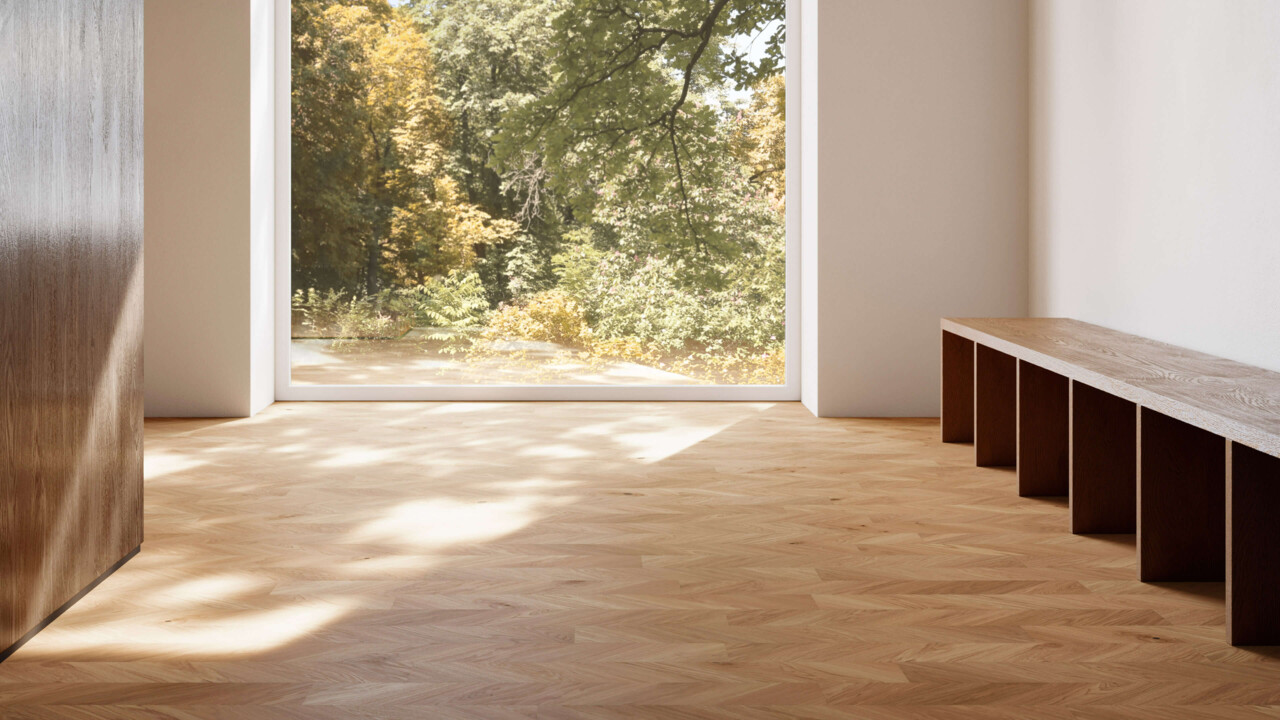 Ein Spiel natürlicher Diagonalen, die Metamorphose von Wald zu Parkett – das Konzept von Spinpark ist denkbar einfach, doch bringen die Verflochtenheit von Natur und Verlegehandwerk, gepaart mit einer neuen Schnitt-Technik, eine völlig neue Kreativität auf den Boden.