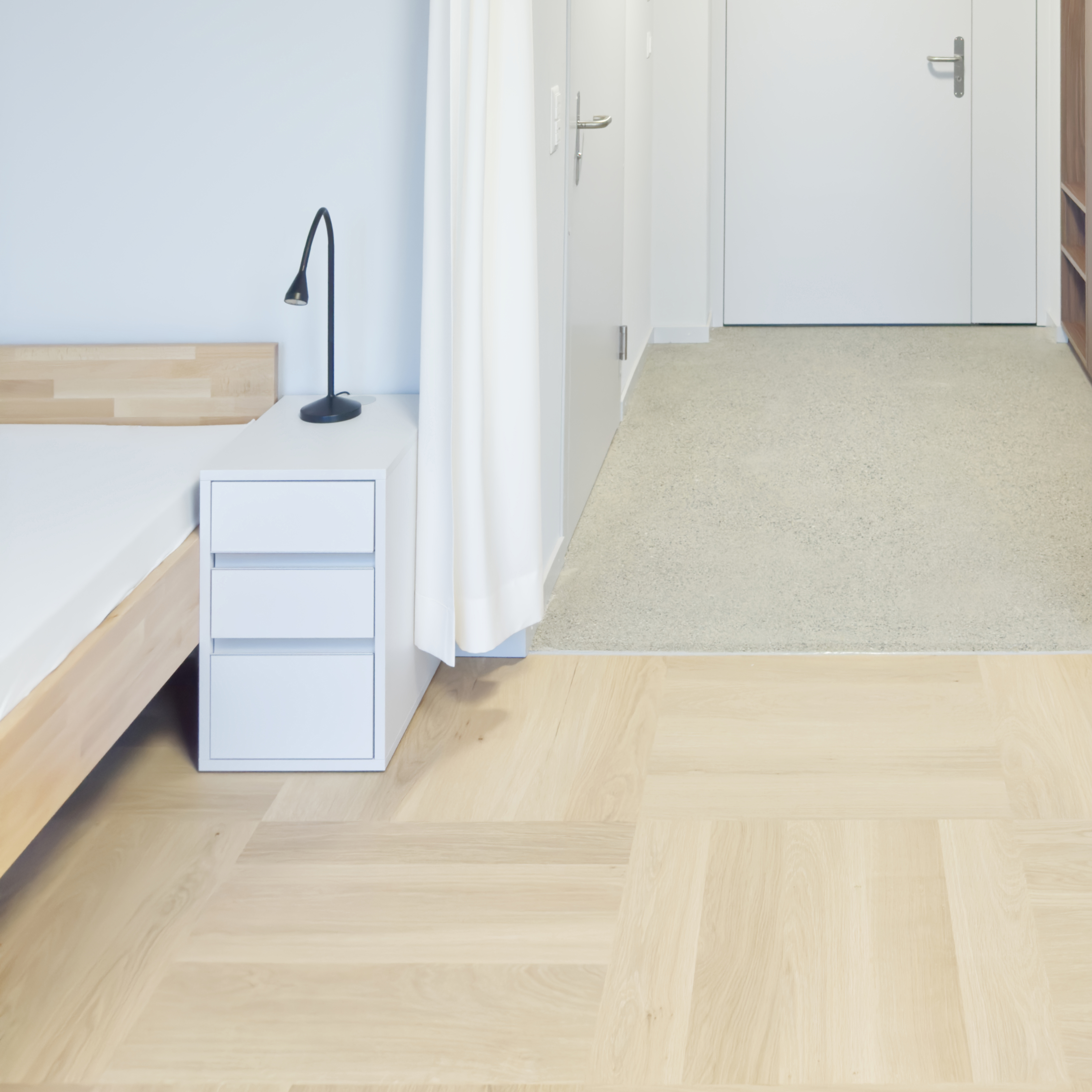 Im Haus wurden Böden mit Formpark Quadrato in der Holzart und -farbe Eiche Natur verlegt – einem hochwertigen Eichenparkett, das sich durch seine vielen verschiedenen Verlegemuster auszeichnet. Im Würfelverband verlegt, wirkt der Boden gleichzeitig ruhig, geordnet und dennoch lebendig. Das Format im Verhältnis 5:1 erlaubt Gestaltungen, die weit über klassische Muster hinausgehen – ideal für Räume, in denen eine besondere Atmosphäre entstehen soll. Der Parkettboden bringt Wärme in die Räume, dämpft Geräusche und ist zugleich robust und pflegeleicht. Eine passende Wahl für ein Haus, in dem Menschen zur Ruhe kommen und zu sich finden sollen.