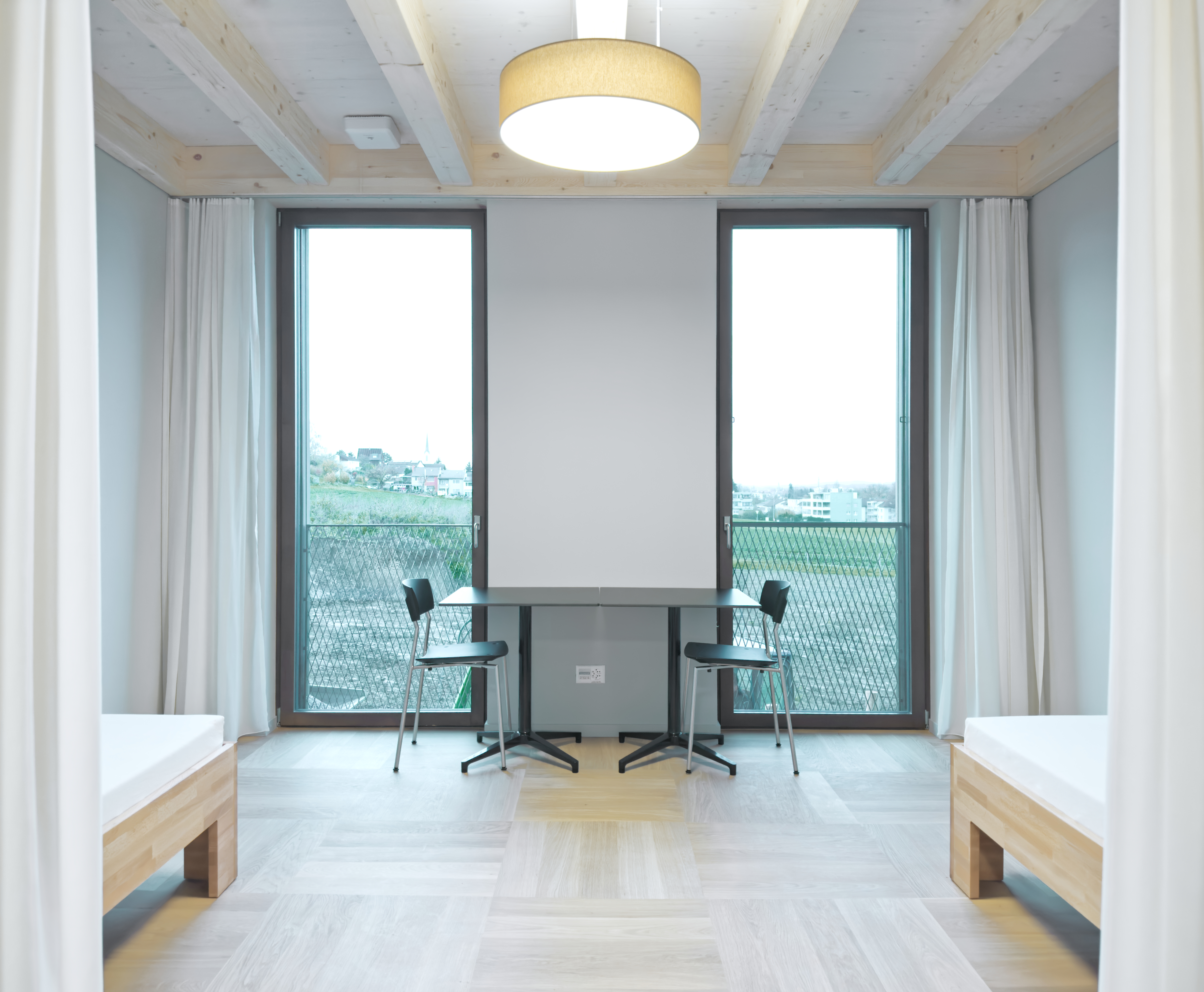 Verteilt auf drei Obergeschossen finden rund 60 Patientinnen und Patienten im Haus T Platz. Neben Einzel- und Zweierzimmern umfasst das Raumangebot auch Aufenthalts- und Gemeinschaftsräume für Rückzug und Begegnung sowie Therapiebereiche. Im neuen Haus können unterschiedlichste Angebote stattfinden – von kurzfristiger Krisenintervention über transkulturelle Betreuung bis hin zur Behandlung stressbedingter Erkrankungen. Die kompakte Struktur des Gebäudes, das in vorgefertigter Holzbauweise erstellt wurde, ist gegliedert durch vier auskragende Gebäudeecken – ein Detail, das nicht nur die Orientierung erleichtert, sondern auch vielfältige Raumsituationen schafft.