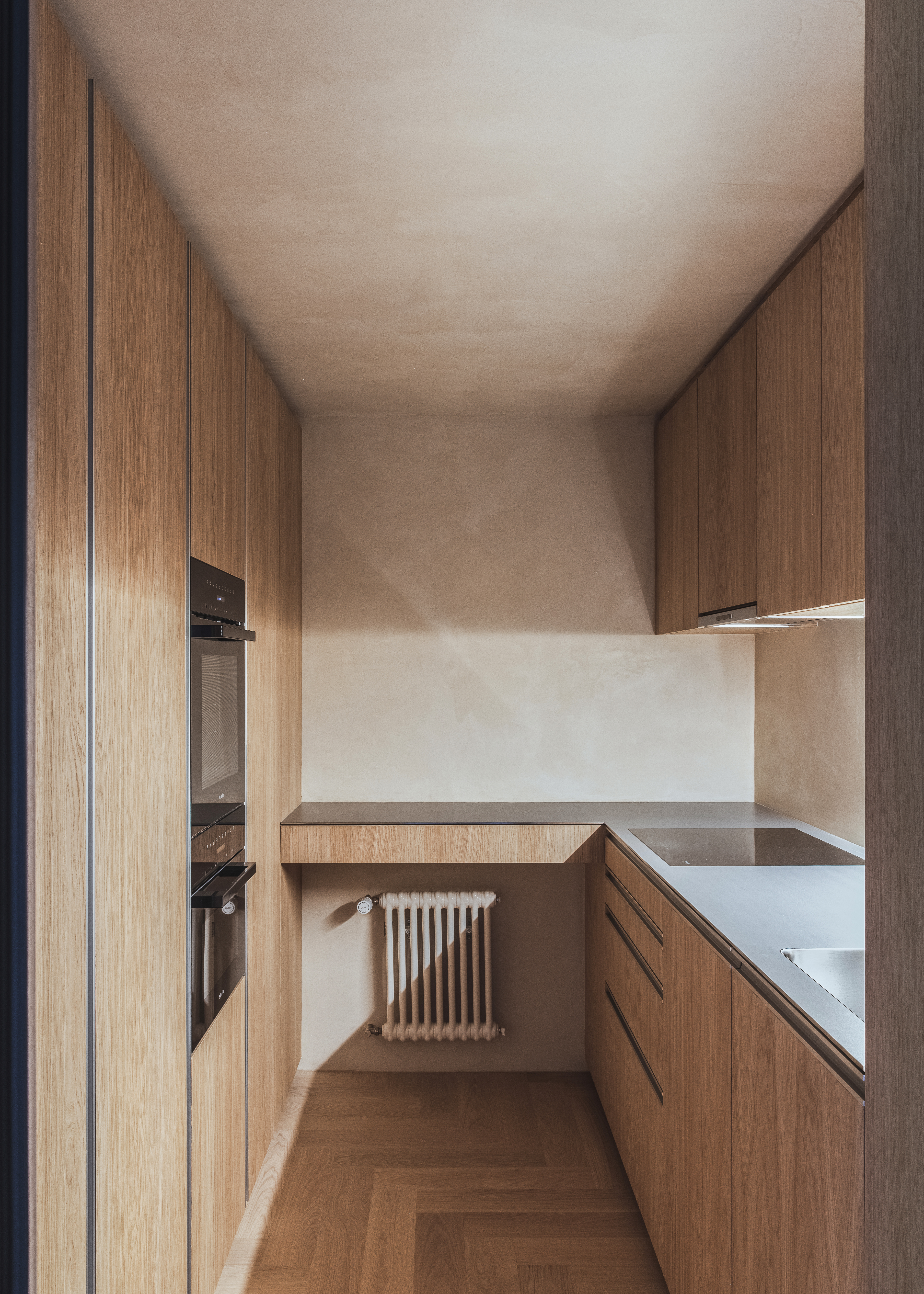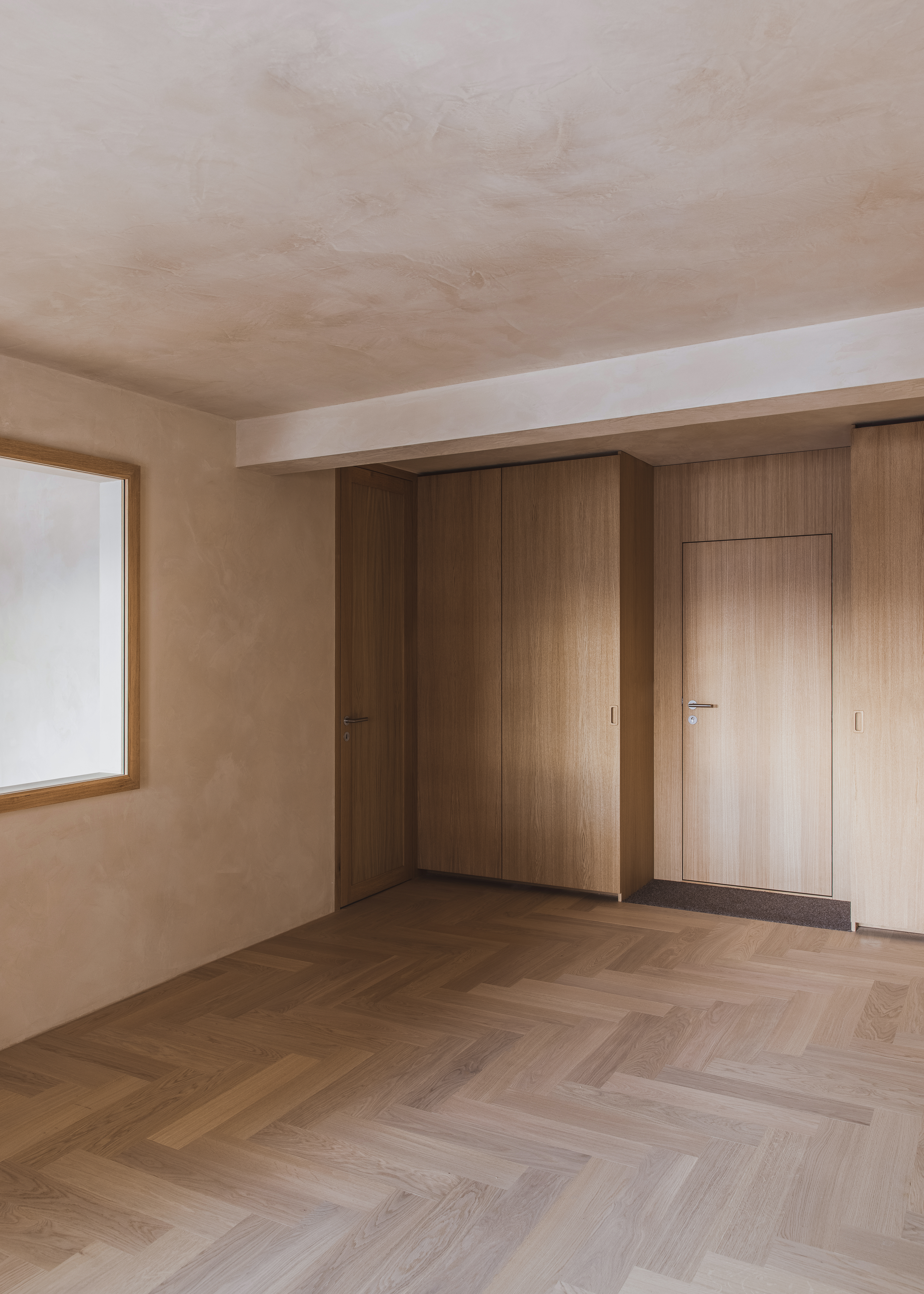 Die Verlegerichtung des Parketts wurde gezielt auf das einfallende Licht ausgerichtet, wodurch das Licht tief in den Raum eindringen kann. Dies bewahrt die Tiefe der natürlichen Farben, ohne dabei erdrückend zu wirken.