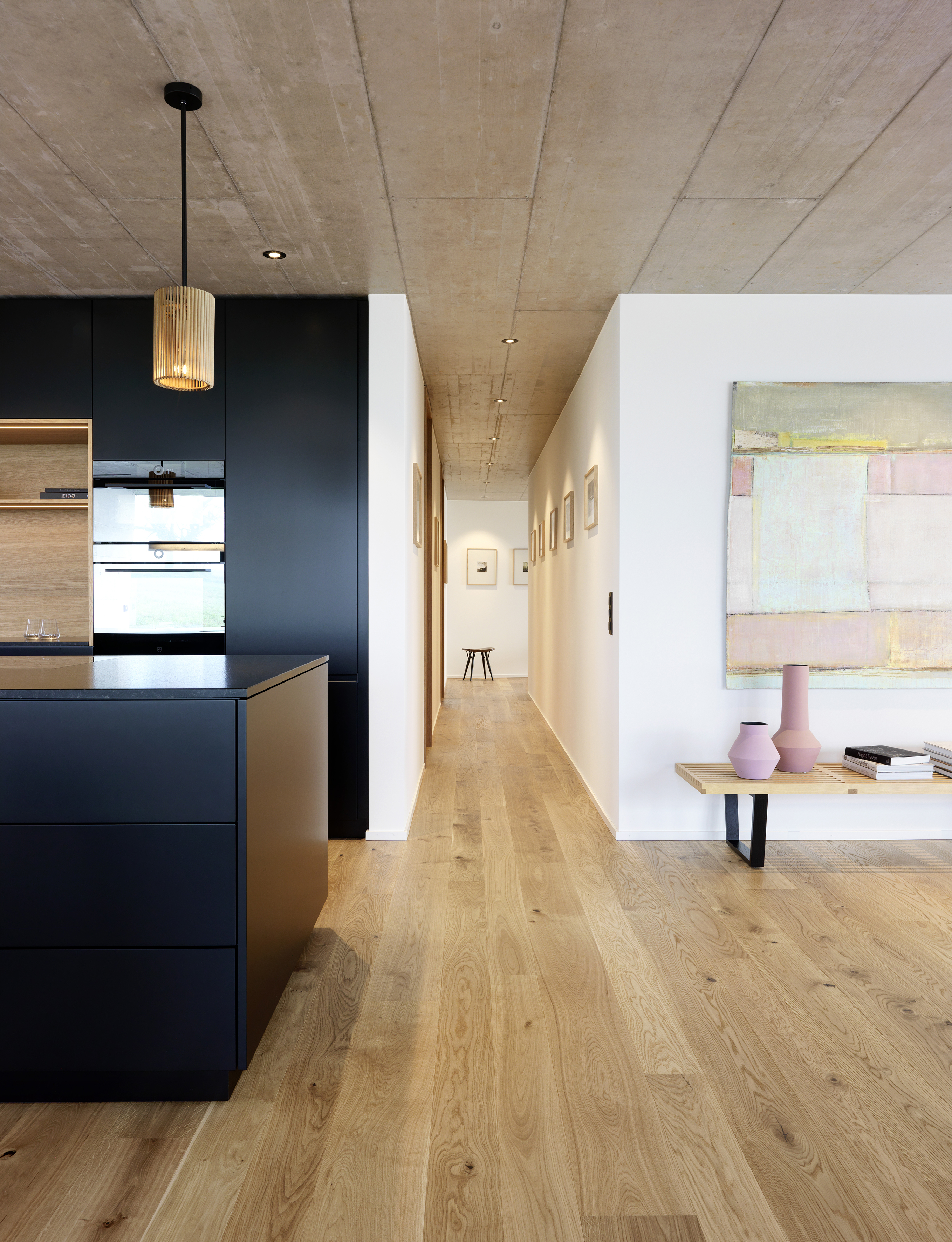 The unobstructed view of the Alps, forests, and meadows was one of the reasons for buying the apartment on the top floor of the three-storey terraced building on the outskirts of Stetten in the canton of Schaffhausen, and the opportunity to design the interior freely was another.