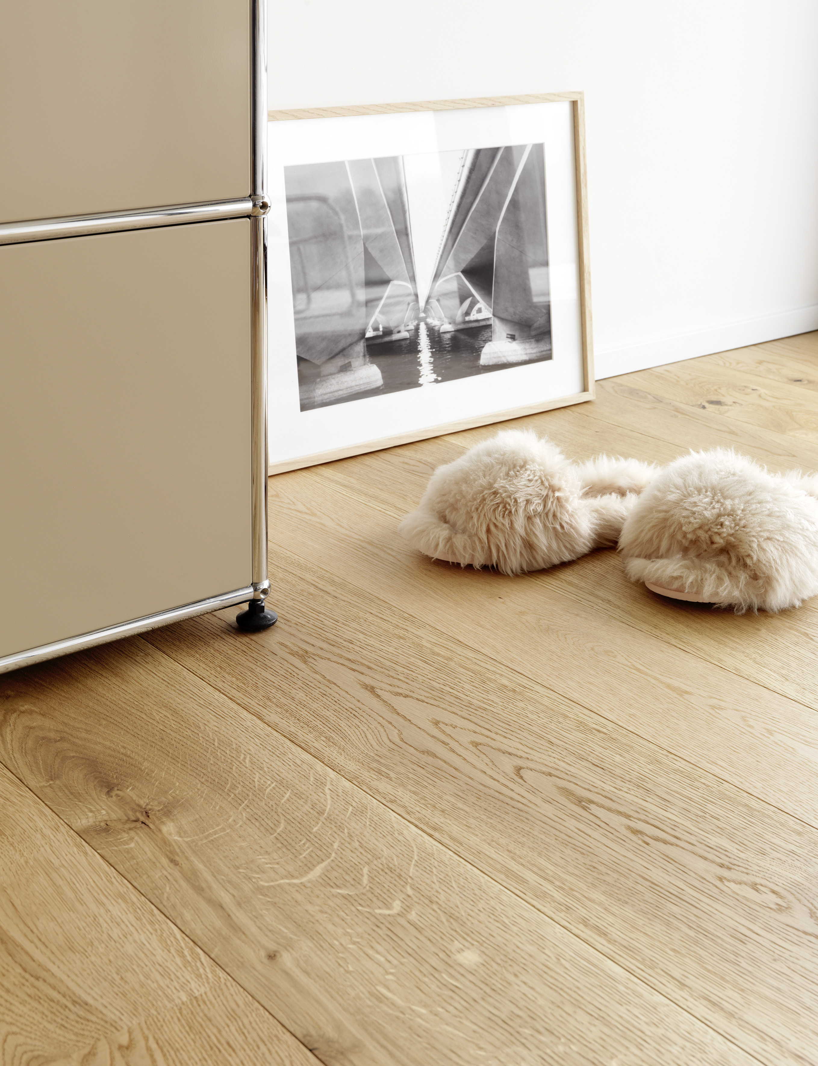 Thanks to a smart construction and a 3.5 mm thick wear layer of European oak, the parquet is also well suited to underfloor heating – an ideal prerequisite for watching hares and deer from the sofa even in the cold season.