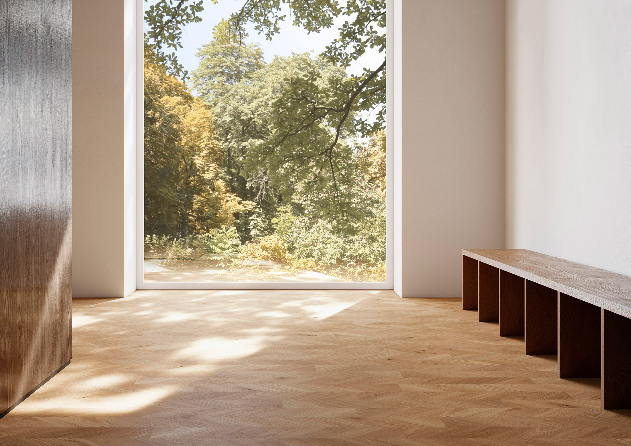 Inspirés par la nature, Bauwerk Parkett et atelier oï ont repensé le parquet. L’idée d’entamer la découpe des couches d’usure des lames de bois à un angle de 45° à l’aide d’une technique de coupe innovante.
