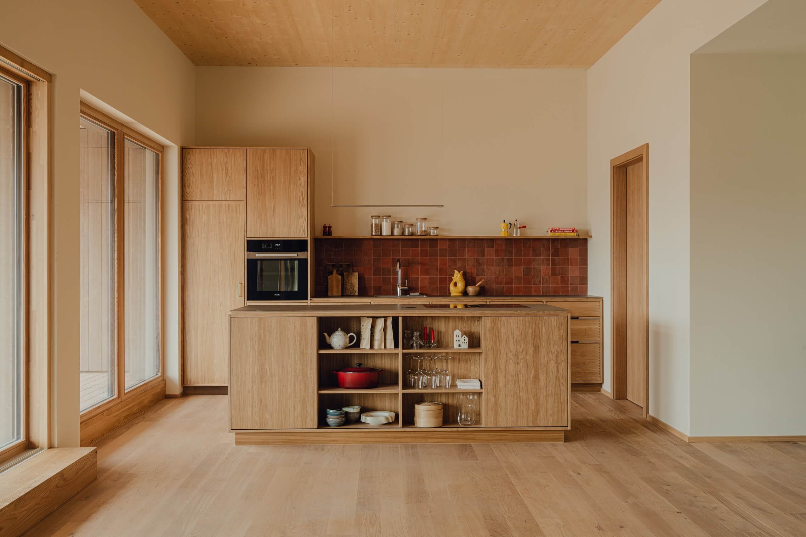 Dans le hall, les clients sont accueillis par un parquet à lames courtes de la série Unopark, de teinte chaude, légèrement brossé et également huilé naturel, en pose à bâtons rompus, ce qui offre à l’intérieur rectiligne et moderne une scène noble et de qualité supérieure. Dans les appartements, le choix s’est porté sur le parquet à lames courtes Monopark dans la teinte chêne Farina, tandis que pour leur propre appartement, les maîtres d’ouvrage ont opté pour le format à lames larges Trendpark chêne nature.