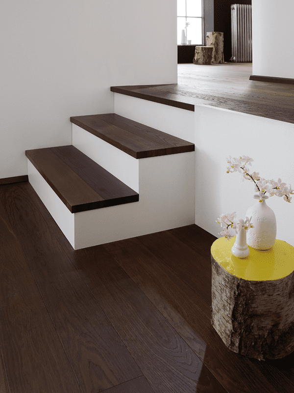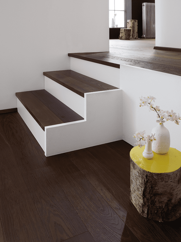 La tecnica di piegatura sviluppata da Bauwerk Parkett permette di realizzare i bordi dei gradini senza interruzioni visibili, e quindi senza compromettere la loro uniformità. Il risultato? Continuità e armonia tra i due lati del gradino, l’impiego dello stesso trattamento sull’intera superficie e la massima protezione dei bordi, per un prodotto pregiato che risulterà identico alla superficie del parquet posato nella stanza.